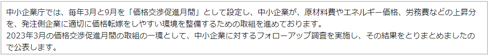 中小企業庁が今年6月に発表した『中小企業向けに調査した価格交渉促進結果』が下記の引用内容になります。