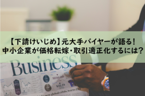 【下請けいじめ】元大手バイヤーが語る!中小企業が価格転嫁・取引適正化するには? こちらの記事では中小企業が価格転嫁する方法についてご紹介します。 \今回の記事はこんな方にオススメです/ ・中小企業の営業担当の方・中小企業の経営者の方・大手...