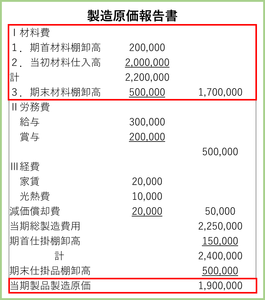 確認するポイントは材料費の右下の『1,700,000』の数値と、最下部の当期製品製造原価の『1,900,000』の数値です。