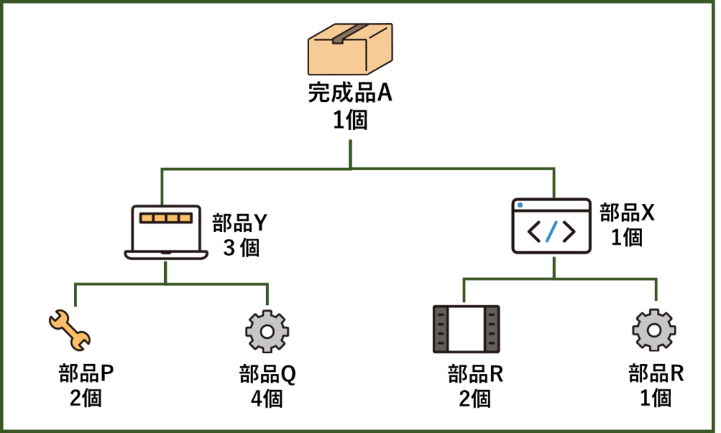 下記のケースでは、完成品A1個を製造する為に必要な部品Pは1×3×2=6個となります。