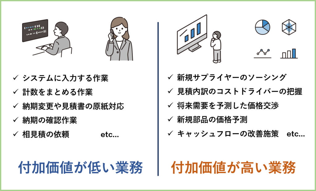 調達部門で付加価値の低い仕事と高い仕事は何があるでしょうか?思い当たるものを分けてみましょう。