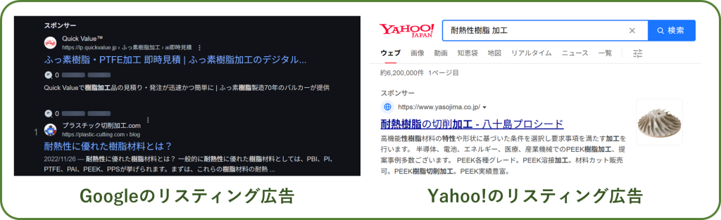 GoogleやYahoo!で、「プラスチック射出成形 東京」「耐熱性樹脂 加工」「小ロット プラスチック部品」といったキーワードで検索している、まさに今、情報を探している可能性が高い見込み客に直接アプローチできます。クリックされた分だけ費用が発生する仕組みなので、無駄が少ないのが特徴です。