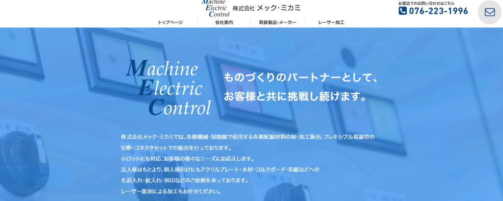 2社目は電装資材の販売からハーネス加工、フレキシブル電線管の加工・セット販売、レーザー彫刻まで幅広い対応力が強みの株式会社メック・ミカミです。