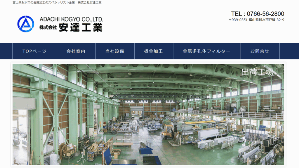 株式会社安達工業は、富山県射水市に本社を構える板金加工・金属フィルターの専門メーカーです。機械・建築・鉄道・食品機器向けの板金加工に加え、純ニッケル製などの金属多孔体フィルター製造にも対応。