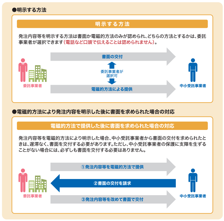 口頭発注によるトラブルを防ぐため、委託事業者は発注に際して、給付の内容、代金の額、支払期日、支払方法などの事項を、書面または電磁的方法(電子メールなど)により、遅滞なく中小受託事業者に明らかにする必要があります。