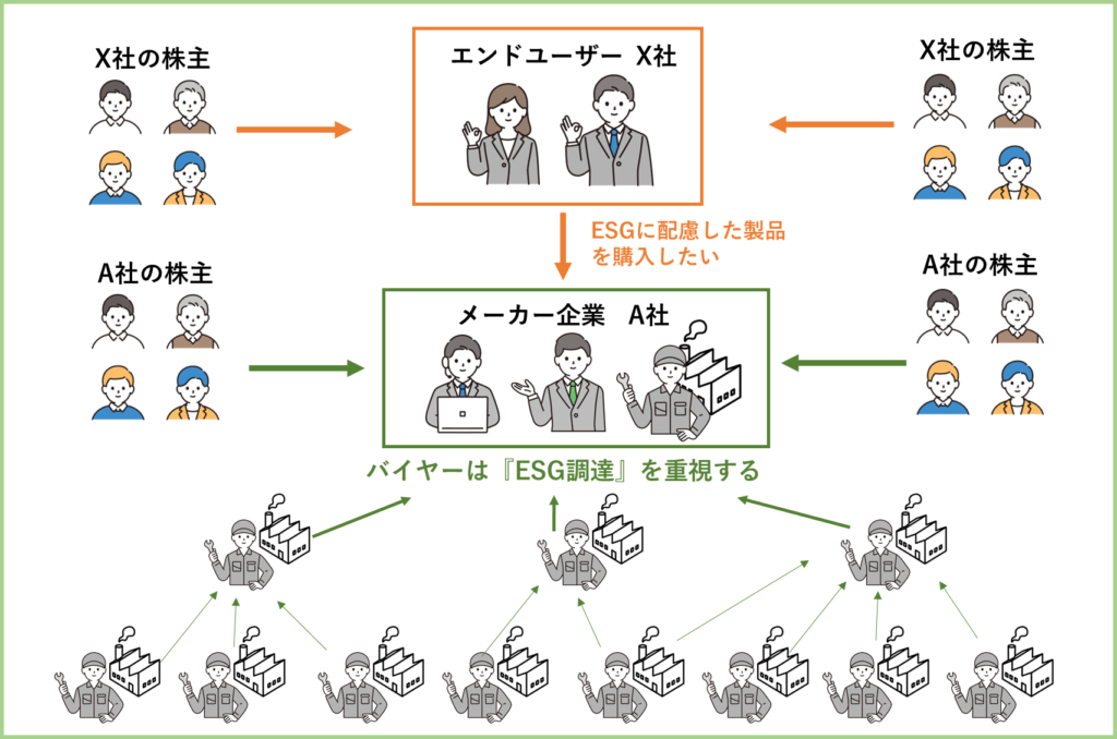 すると、最終メーカーA社としては、ESGに配慮した製品を製造しようと考え、材料調達の段階から『ESG調達』を推進するようになります。