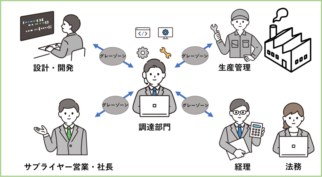 購買部は様々な関係部署と仕事をする為、関係部署と購買部のどちらが行っても良いグレーゾーンの業務を引き受けるかどうかも忙しさに影響します。(下記の図を参照)