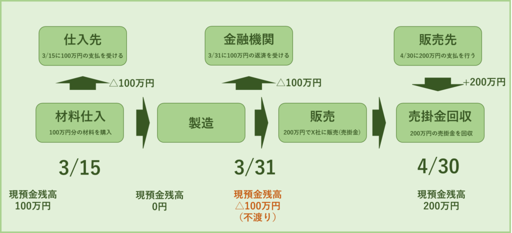ある製造業のA社が100万円の借金を抱えており、20XX/3/31に返済期日だとします。この会社の現在(20XX/3/1)の現預金残高は100万円です。3月に製品を販売することができ200万円の売上を上げることができました。この200万円が振り込まれるのは4月末です。この200万円の製品を製造する為に100万円の材料を購入し、3/15に仕入先に100万円を支払います。その他の現預金の変動が無い場合、このA社は3/31にどうなるでしょうか?